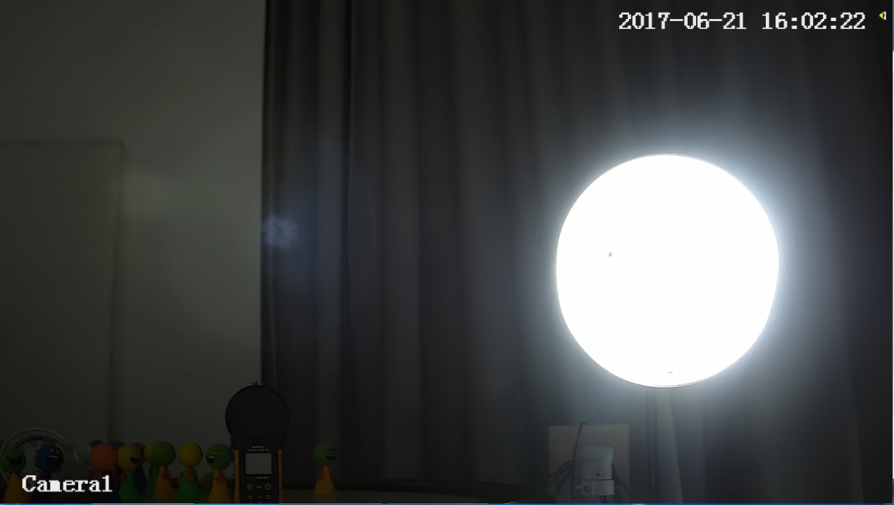 關(guān)閉室內(nèi)電源,將攝像機(jī)對(duì)準(zhǔn)強(qiáng)光燈,將燈內(nèi)放置人偶后開(kāi)啟強(qiáng)光燈,寬動(dòng)態(tài)關(guān)閉時(shí),整個(gè)畫(huà)面的背景處顏色偏暗,而強(qiáng)光燈內(nèi)也顯得較為刺眼。當(dāng)寬動(dòng)態(tài)開(kāi)啟為最低時(shí),背景亮度得到提升,強(qiáng)光燈內(nèi)的亮度也明顯降低。當(dāng)寬動(dòng)態(tài)開(kāi)啟最高時(shí),整個(gè)畫(huà)面色調(diào)更加統(tǒng)一,無(wú)論是背景處還是燈內(nèi)畫(huà)面均顯示更清晰。