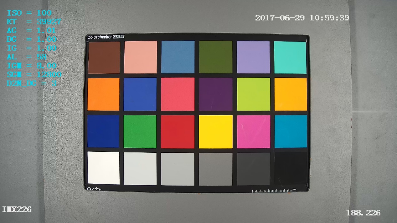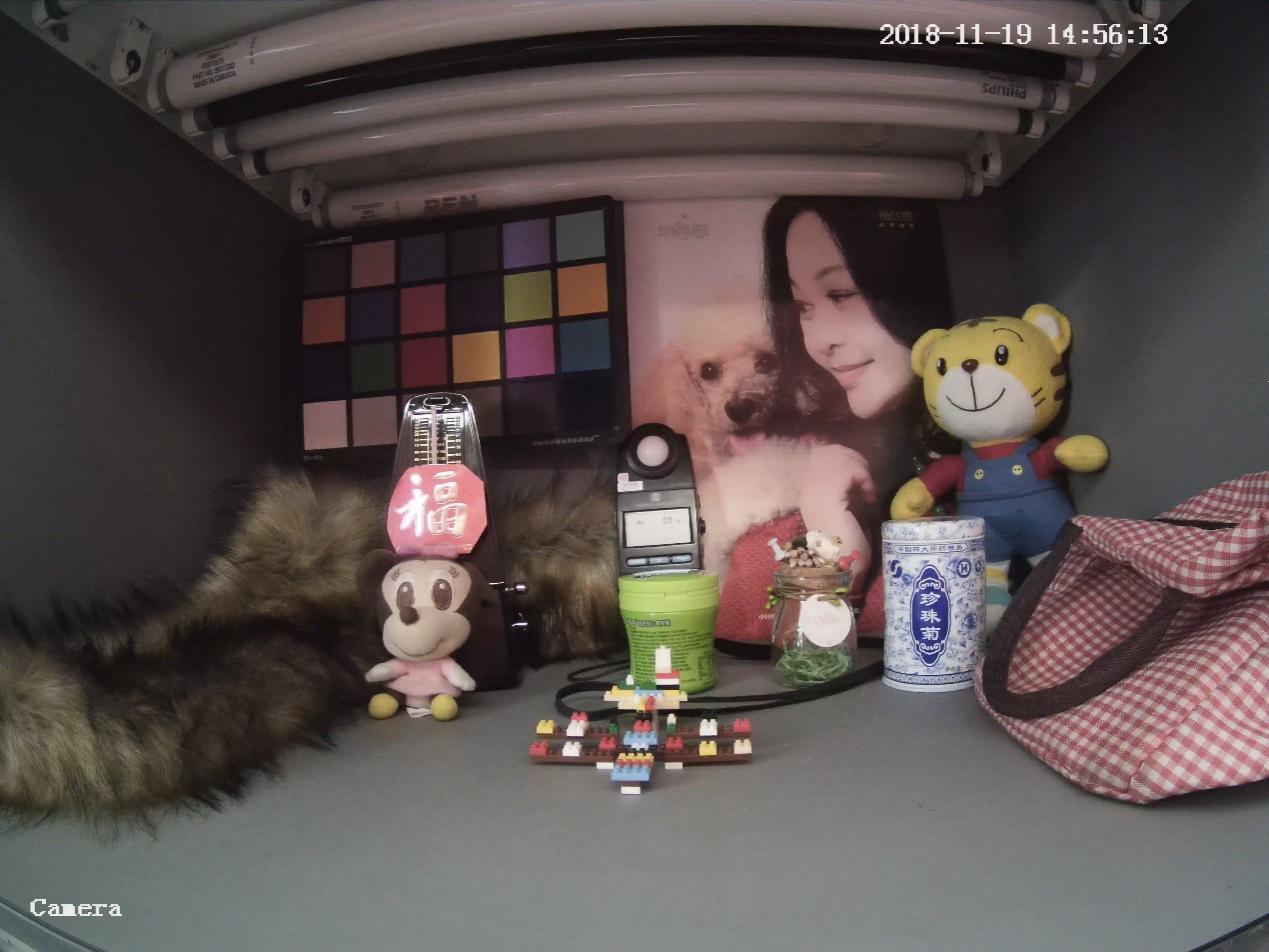 將攝像機置于人工控制照度的暗箱中,在數(shù)字降噪及自動增益功能的輔助下,畫面效果保持較好。在照度值降至0.9Lux左右時,彩色畫面依然干凈清透,人物照片、玩偶的表情清晰可辨,除24色卡中深藍色及綠色辨識度降低,顯示為黑色外,其他色塊的顏色稍偏淡,但整體色塊的層次仍然分明,邊緣呈現(xiàn)清晰,整個畫面成像效果良好。