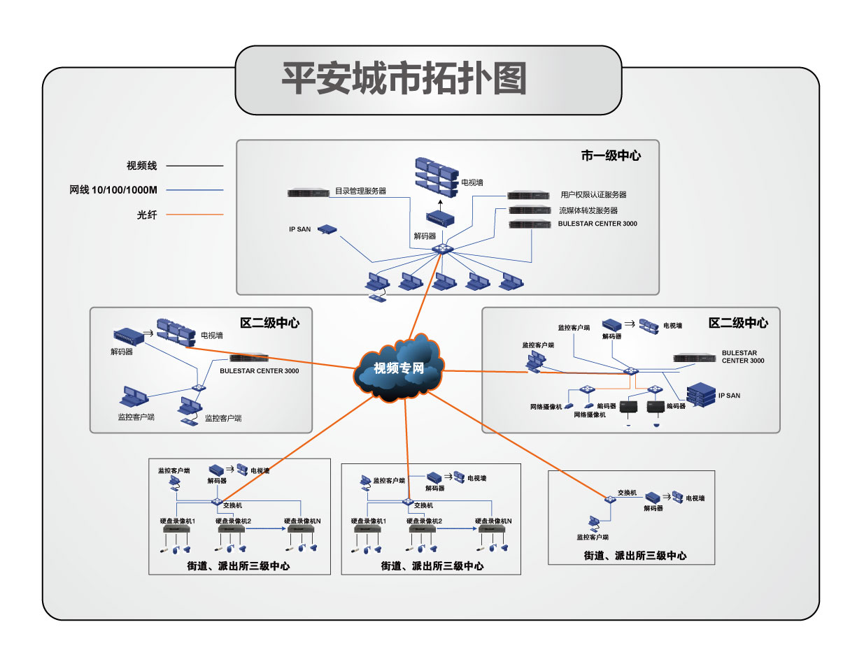 整體網(wǎng)絡(luò)環(huán)境是派出所、分局、市局三級(jí)樹(shù)形網(wǎng)絡(luò)結(jié)構(gòu),各個(gè)分局是網(wǎng)絡(luò)的匯聚點(diǎn)。各分局監(jiān)控中心負(fù)責(zé)其所轄地區(qū)的監(jiān)控系統(tǒng)數(shù)據(jù)匯集,負(fù)責(zé)其下轄監(jiān)控點(diǎn)設(shè)備的設(shè)備管理、控制、報(bào)警處理、錄像、錄像回放、用戶(hù)管理等功能。市局監(jiān)控中心負(fù)責(zé)全市所有監(jiān)控系統(tǒng)數(shù)據(jù)的匯集,監(jiān)督、管理各個(gè)分局的日常工作情況,集中對(duì)全市的公安事件進(jìn)行監(jiān)督管理。